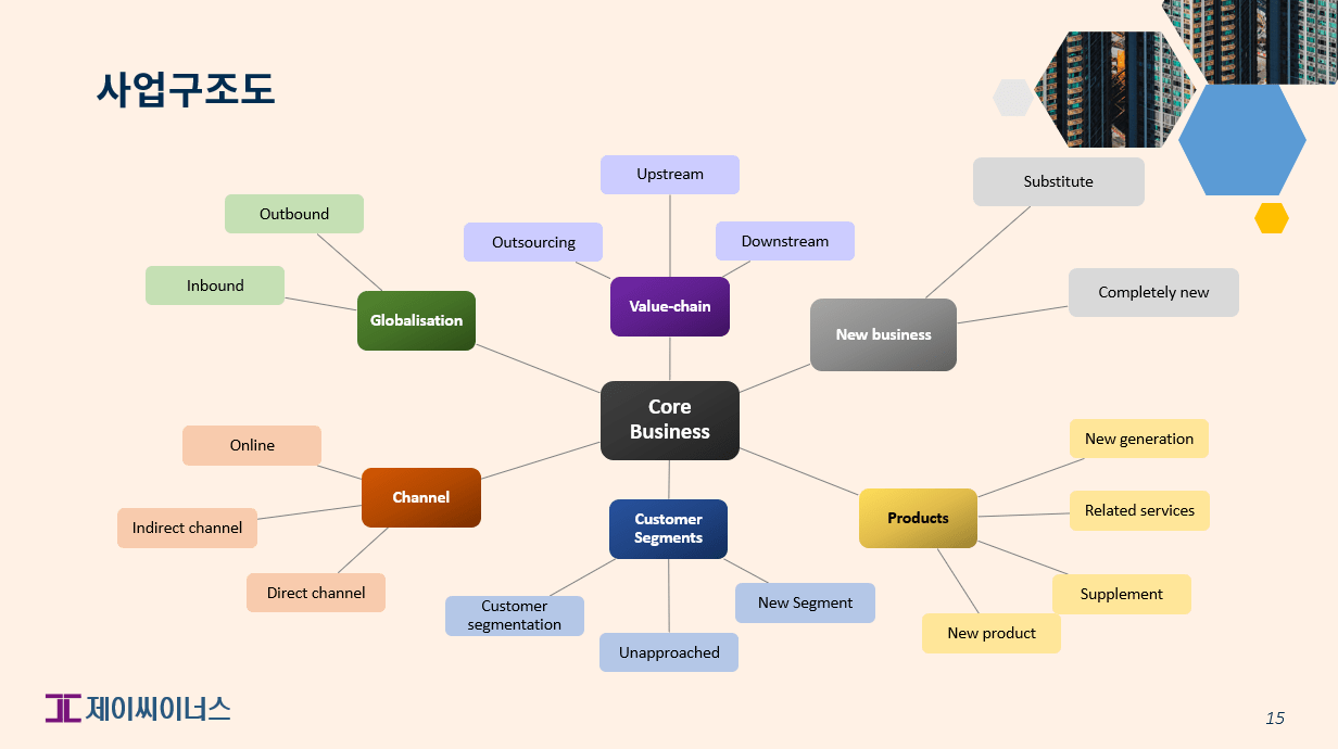 위의 구조도를 그리는 순서는 매우 간단합니다. 먼저 핵심 사업을 제일 가운데 배치합니다. 그리고 핵심 사업을 중심으로 그 사업을 구성하는 모든 요소를 거미줄처럼 배열하는 것입니다. 위의 경우엔 핵심 사업의 구성 요소를 6가지로 보았습니다. 제품의 벨류 체인, 세계화, 유통 채널, 고객 세그먼트, 제품의 분류, 그리고 신사업이 그것들입니다. 비즈니스를 구성하는 요소가 더 있다고 판단되면 추가할 수 있습니다. 그런 다음 각 요소가 어떻게 구성되어 있는지, 그리고 각 요소가 어떻게 비즈니스를 구성하는지 생각해 보십시오.